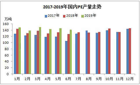 据统计,2019年上半年国内PE产量在867.21万吨,较2018年同期(802.68万吨)增加64.53万吨,增幅在8.04%。2019年上半年国内PE石化大修装置较少,开工率较高在92%-98%之间波动。除此之外,内蒙古久泰能源28万吨/年全密度装置在5月份顺利投产,6月份产量释放产品逐步供应市场。